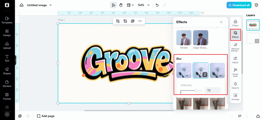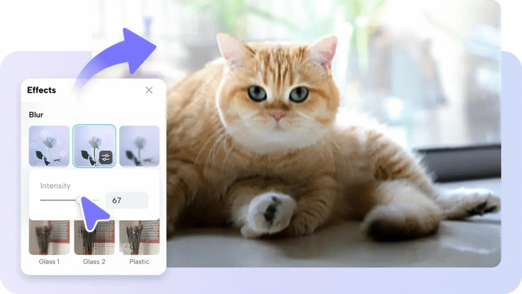 Now it’s time to turn images into low-quality ones with accuracy. In the editor, go to Effects in the left toolbar, then Blur > Low quality. With the Intensity slider, adjust precisely how pixelated or compressed you need your image to look, slide to 100 for the highest degradation.