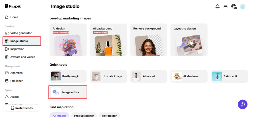 Start by accessing the Image Studio section from the main dashboard, and subsequently accessing the editor by clicking on Image Editor. Click on the Upload button to browse and choose the image you wish to edit from your device, or simply drag and drop it into the editor window.