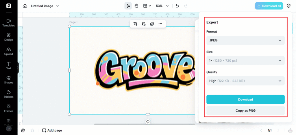 When you are satisfied with the appearance of the image you’ve edited, click the Download all button at the top-right of the editor. In the download dialog box that appears, choose the file format you prefer, specify low quality, and press Download. Your new low-quality image is now ready to be used, ideally for teasers, campaigns, or moody digital storytelling.